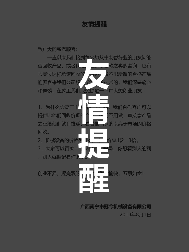 廣西南寧市冠今機械設備有限公司(原南寧市富利機械加工廠)是一家集制香機械設備開發(fā)設計、香品生產(chǎn)銷售于一體的科技企業(yè),引進國際先進技術所研究出來的制香機設備是可生產(chǎn)多種類型的衛(wèi)生香,檀香,竹簽香等。擁有大型香業(yè)基地及堅實的硬件基礎,在制香機械領域具有從研發(fā)到批量生產(chǎn)的全方位優(yōu)勢。